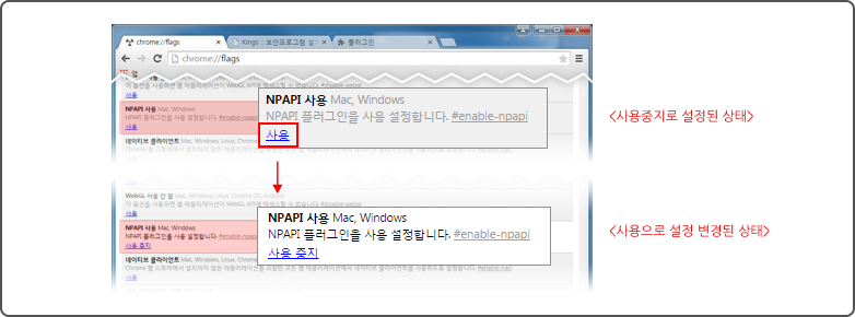 주소에 chrome://flags 을 입력하여 접속 후 [NPAPI 사용] 설정을 확인하고 [사용중지] 되어 있는 경우 [사용]을 클릭하여 [사용]으로 설정을 변경합니다.