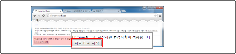 화면 하단에 [지금 다시 시작]을 클릭해 크롬을 재시작합니다.