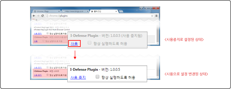 주소에 chrome://plugins 을 입력하여 접속 후 [i-Defense Plugin] 설정을 [사용중지] 되어 있는 경우 [사용]을 클릭하여 [사용]으로 설정을 변경합니다.